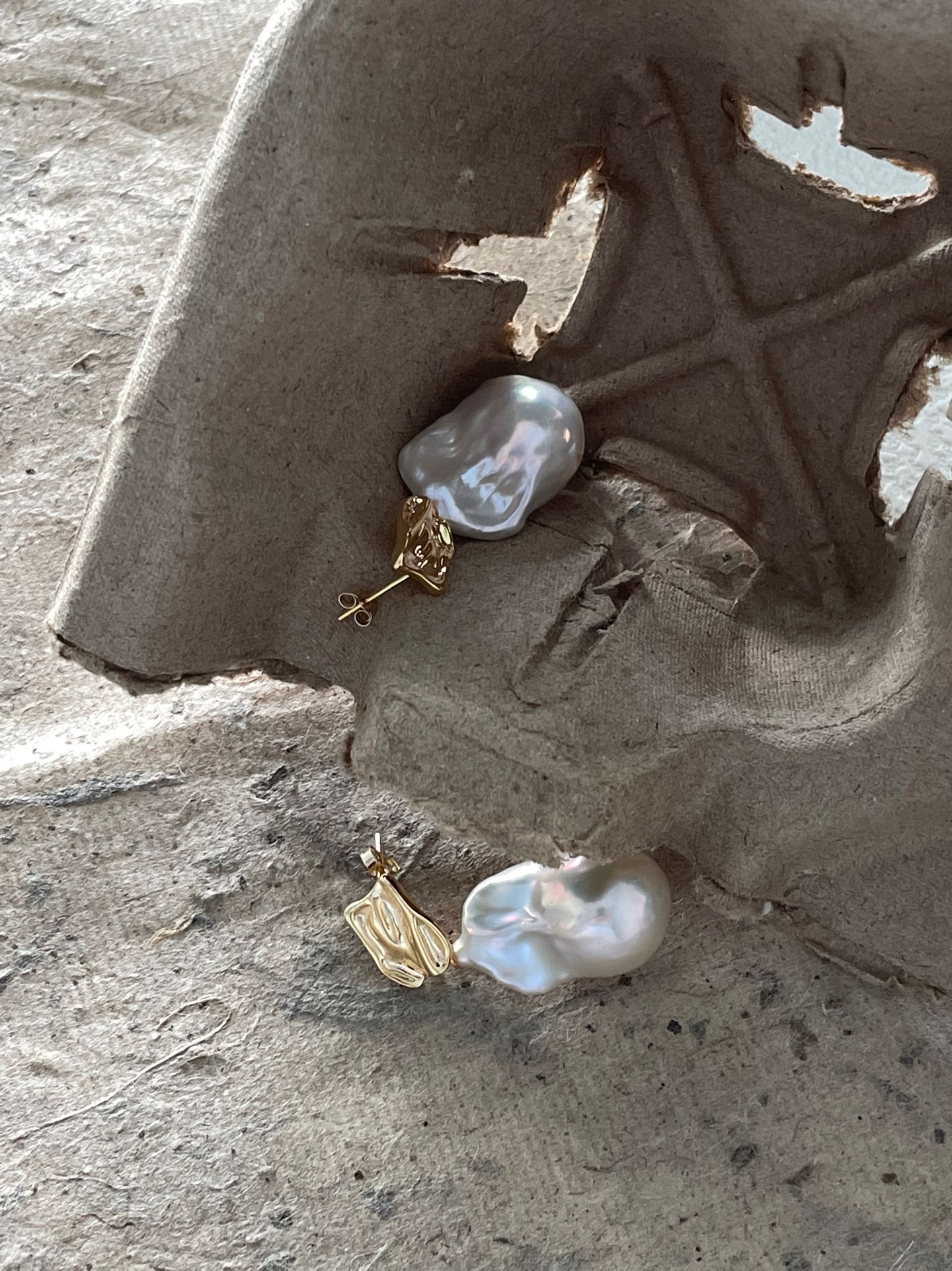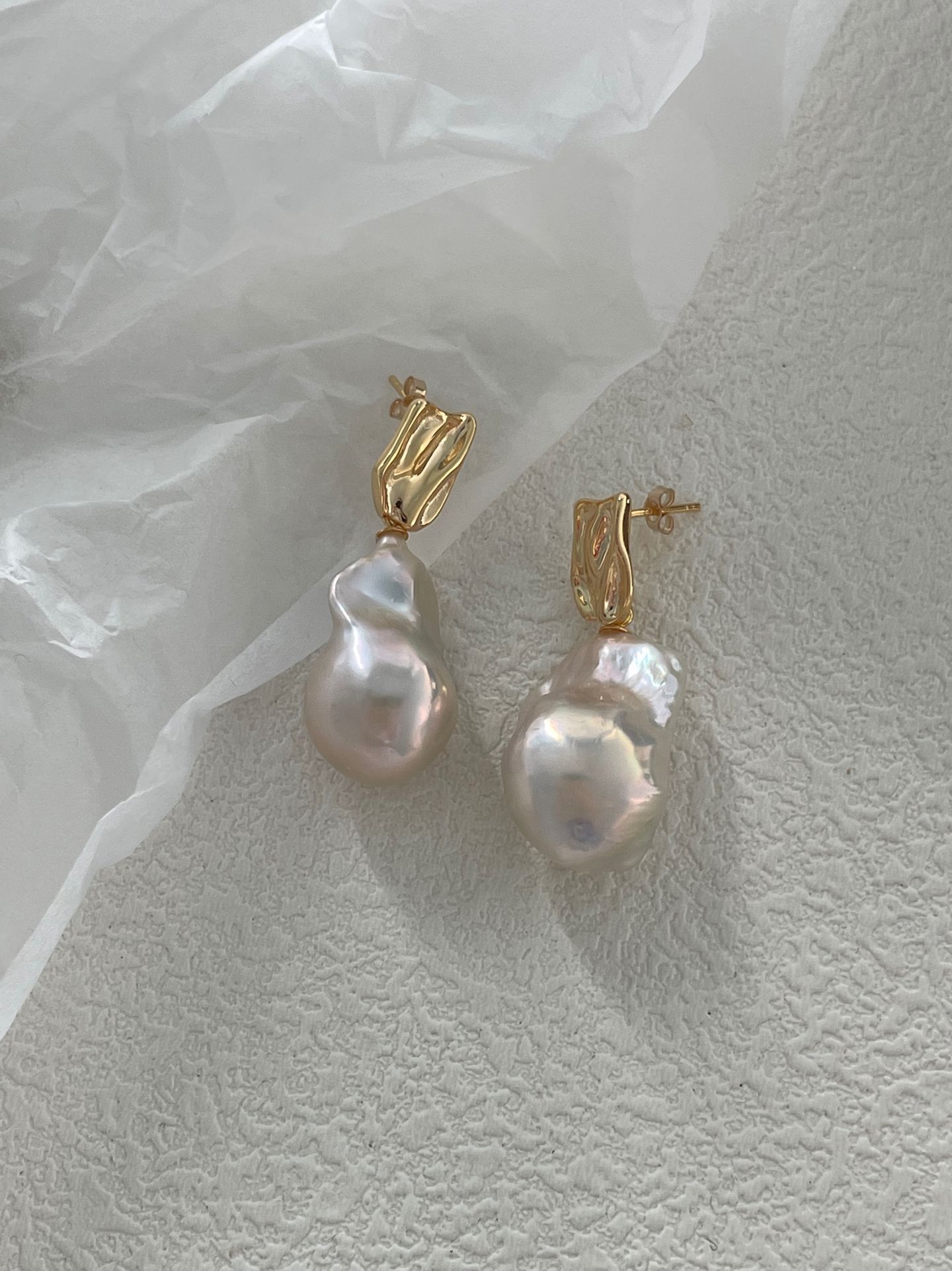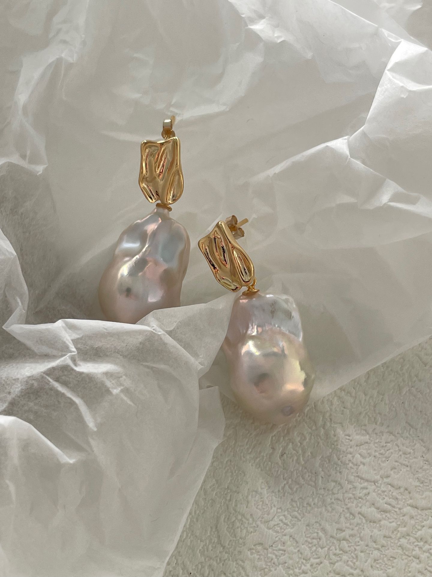These stunning drop earrings showcase oversized baroque pearls with unique, irregular natural shapes and a mesmerizing iridescent luster, embodying the raw and artistic beauty of natural freshwater pearls. The earrings are crafted with high-quality silver plated with 18K gold for the metal settings and earring posts, delivering a luxurious, long-lasting golden sheen and durable construction that perfectly complements the organic elegance of the large baroque pearls.