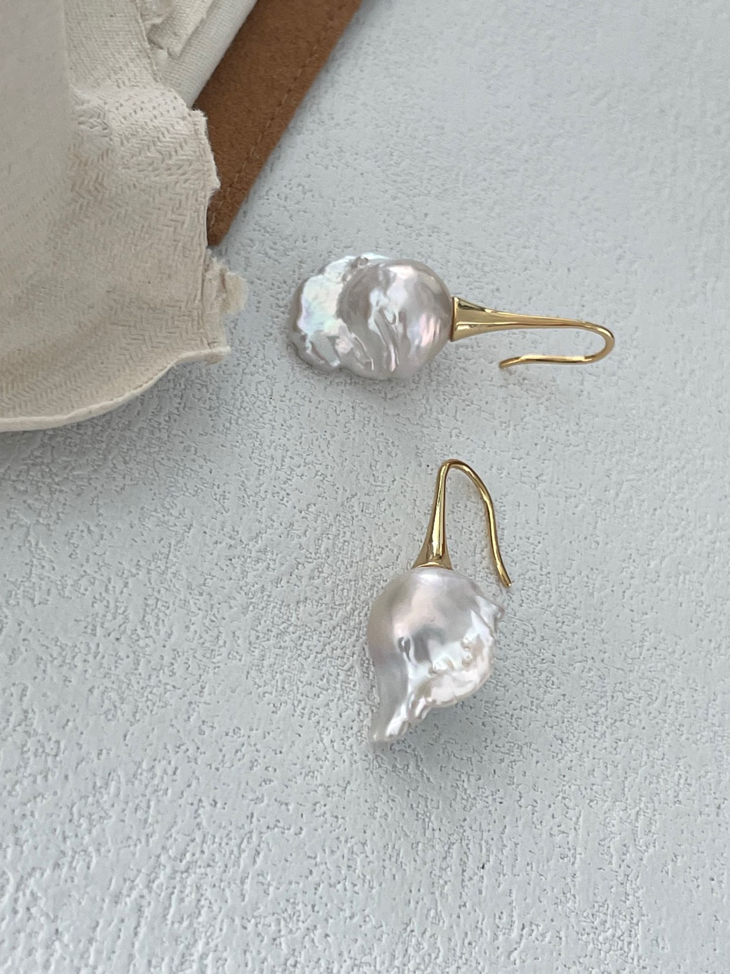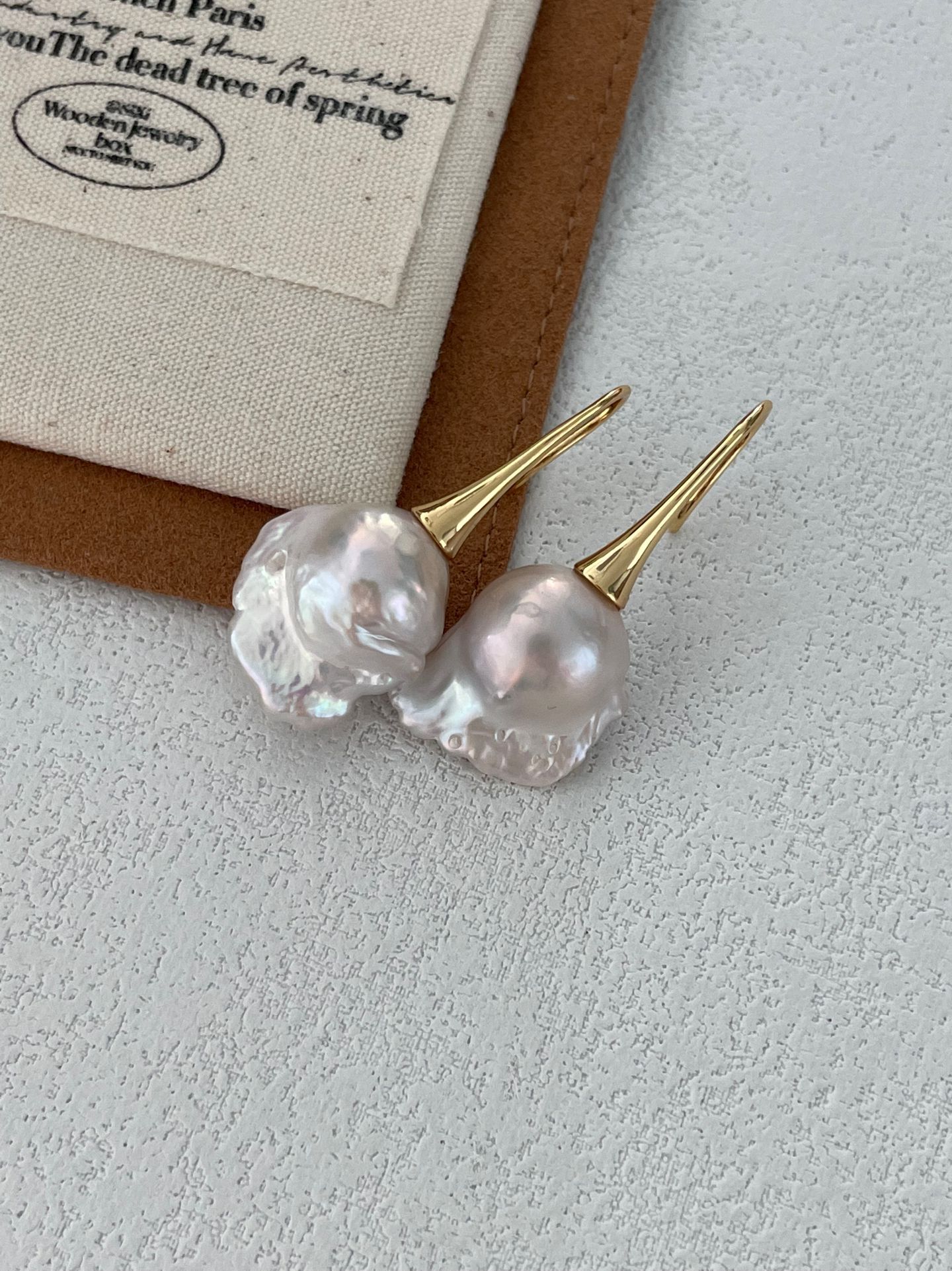 These elegant drop earrings feature a distinctive tall stem design paired with large, irregular baroque pearls, showcasing the unique natural texture and mesmerizing iridescent luster of freshwater pearls. Crafted from high-quality silver plated with 18K gold for the earring stems and all metal components, they deliver a luxurious, long-lasting golden sheen and durable construction, perfectly complementing the organic beauty of the large baroque pearls.