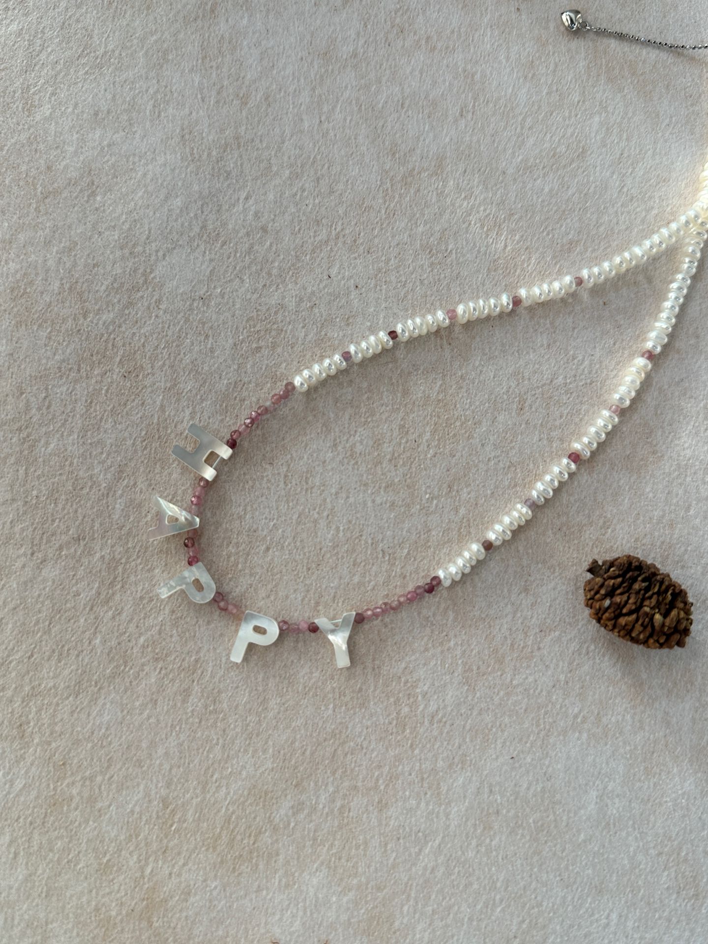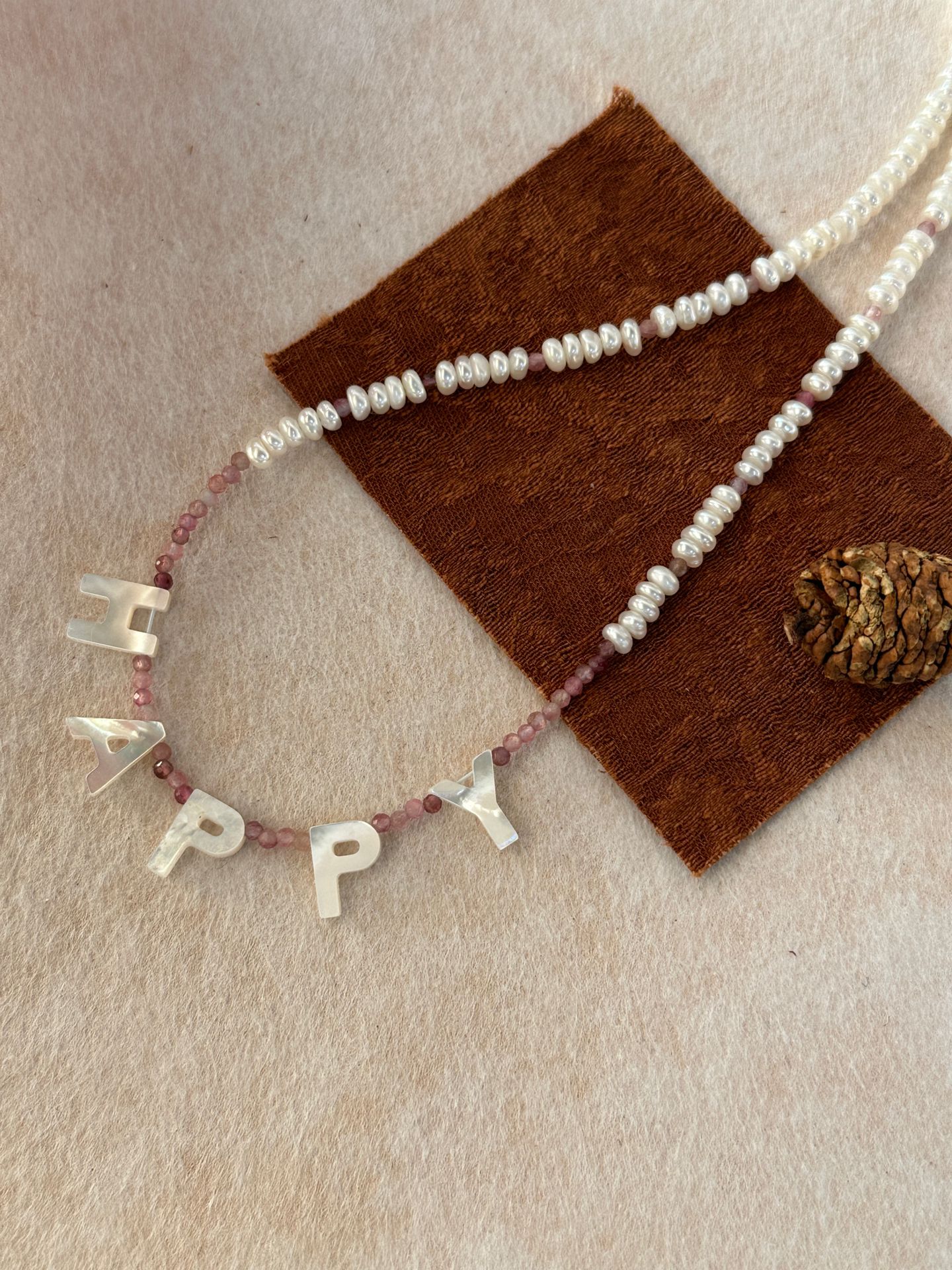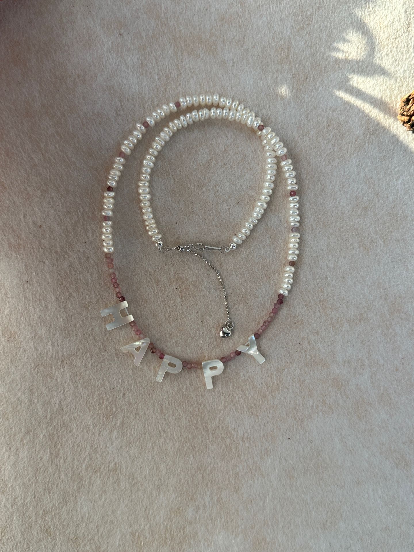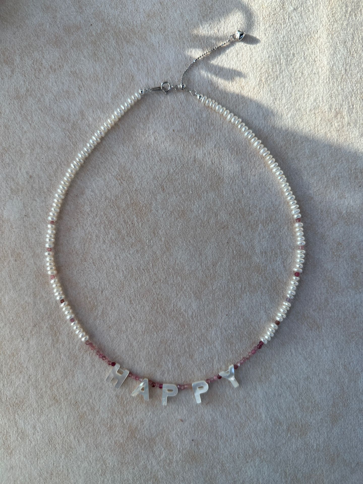 Handcrafted with playful shell letters, delicate pink tourmaline beads, and tiny freshwater pearls, this necklace is a wearable celebration of joy.