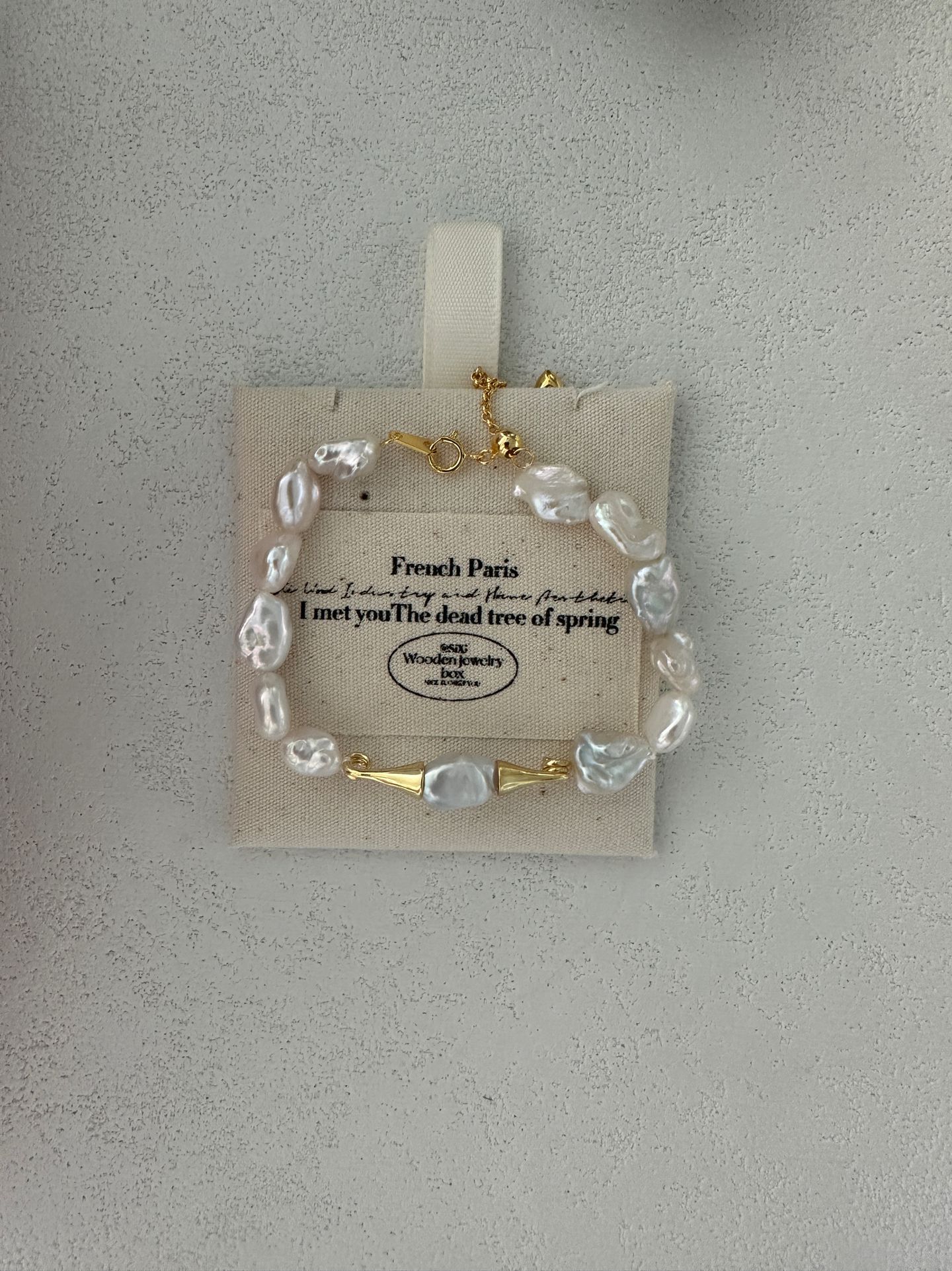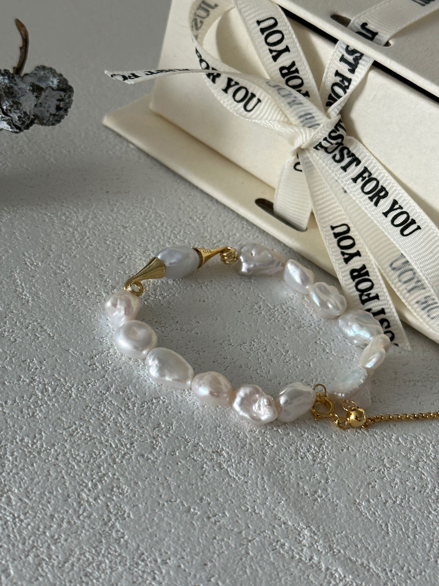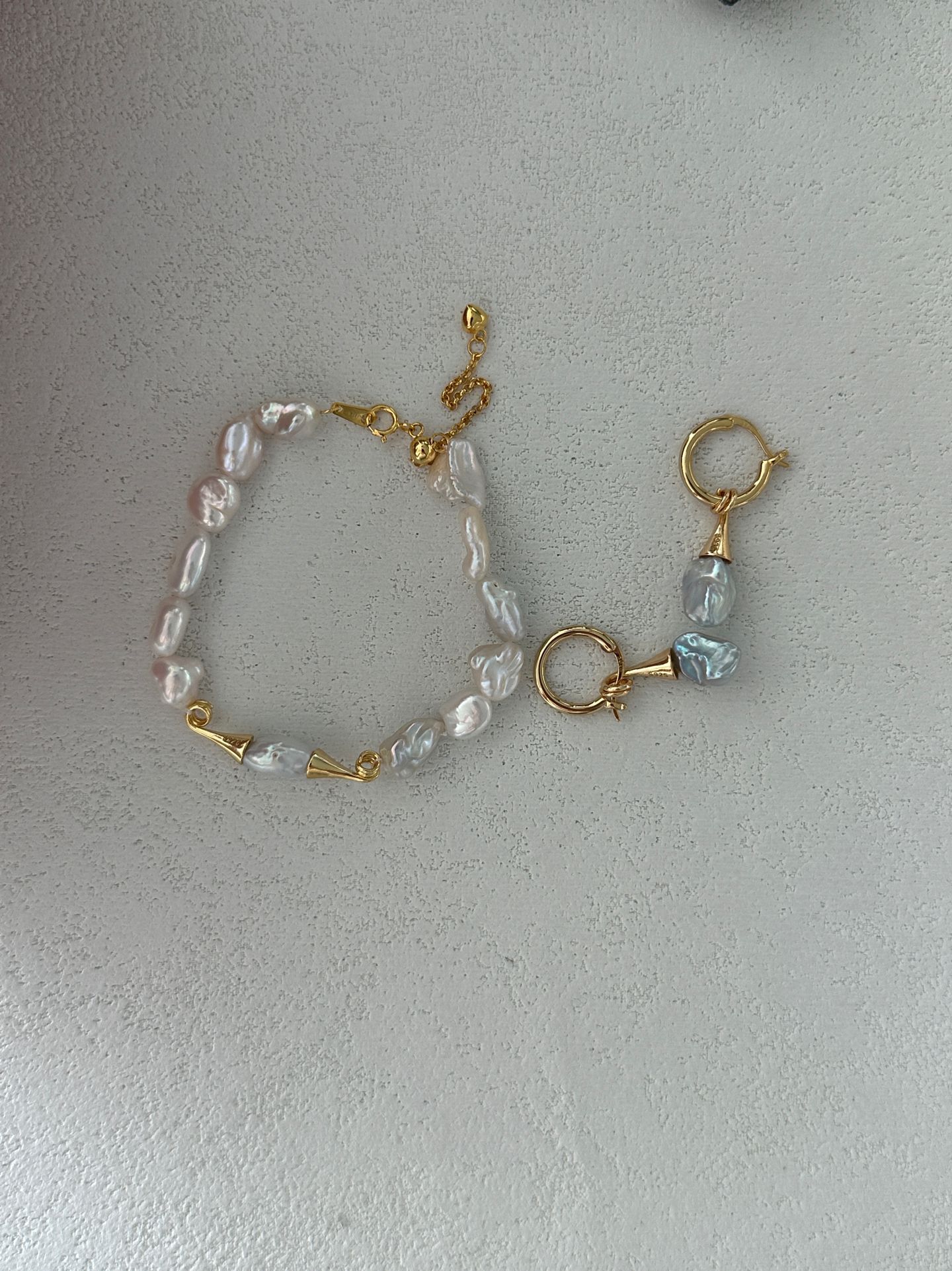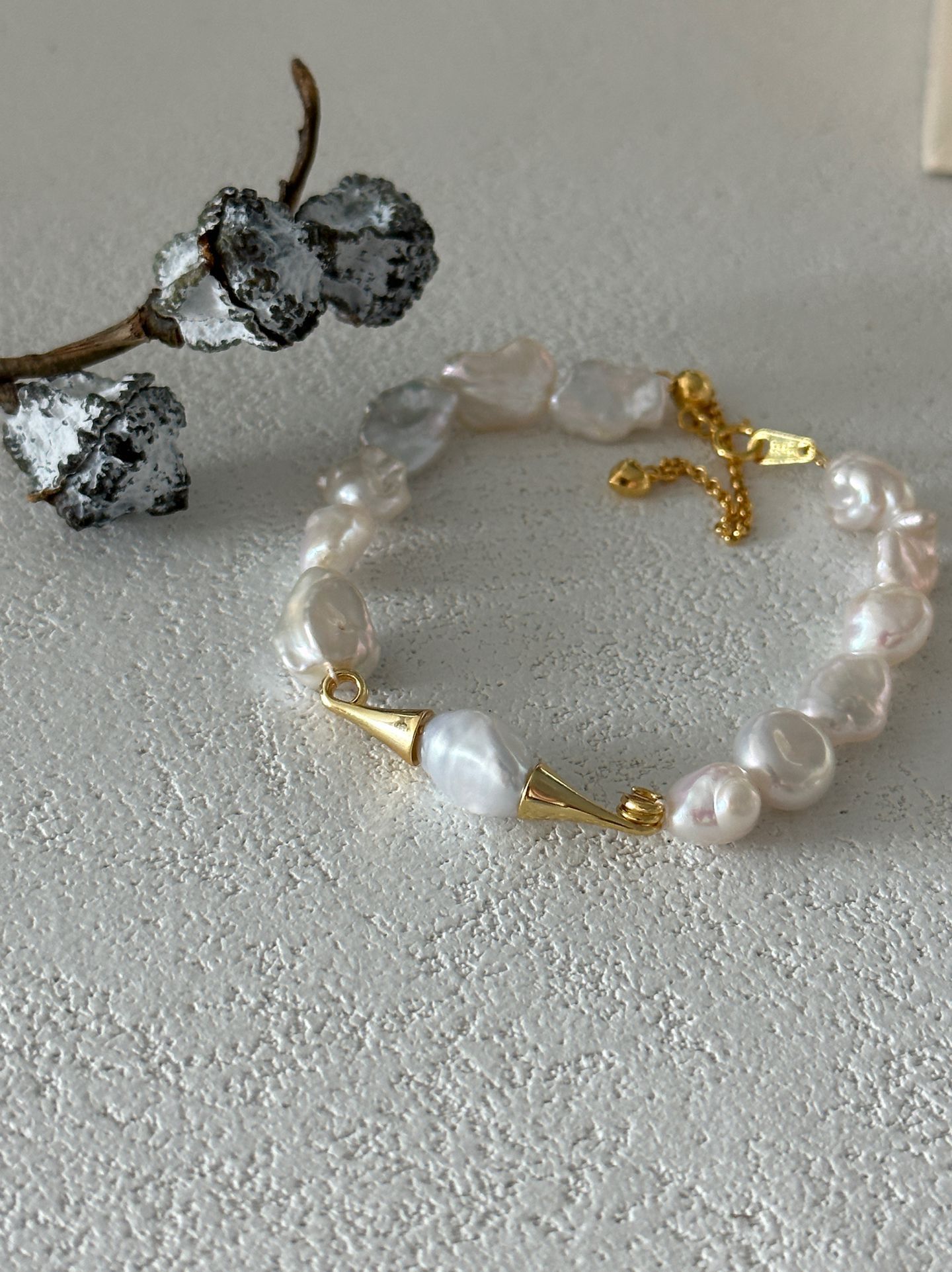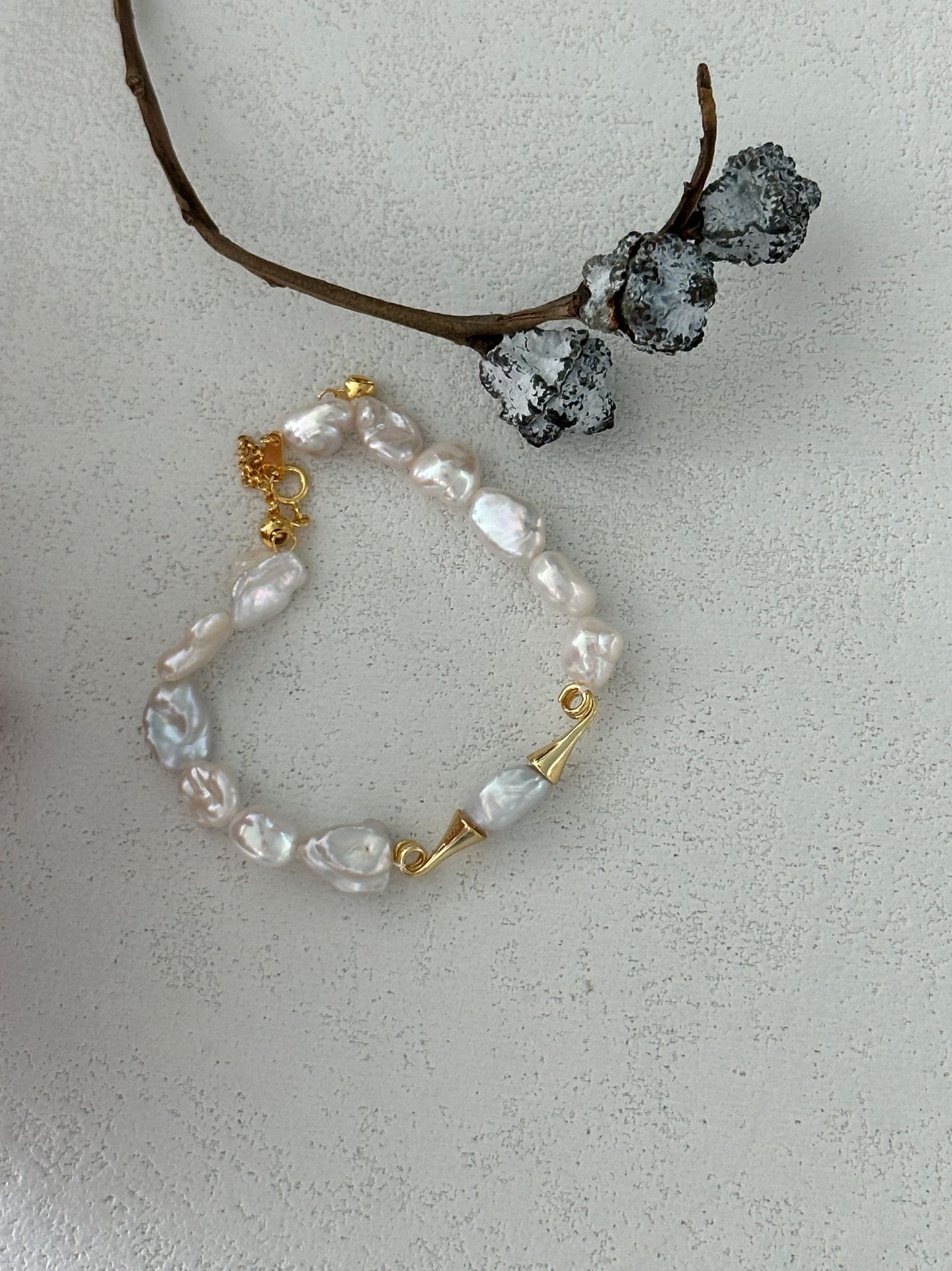 This elegant bracelet features a string of lustrous baroque Keshi pearls, paired with distinctive mustache-shaped metal accents crafted from 18K gold-plated silver, blending natural pearl charm with a playful, chic design. It has a base length of 15cm with a 5cm extension chain, allowing for an adjustable and comfortable fit to suit various wrist sizes.