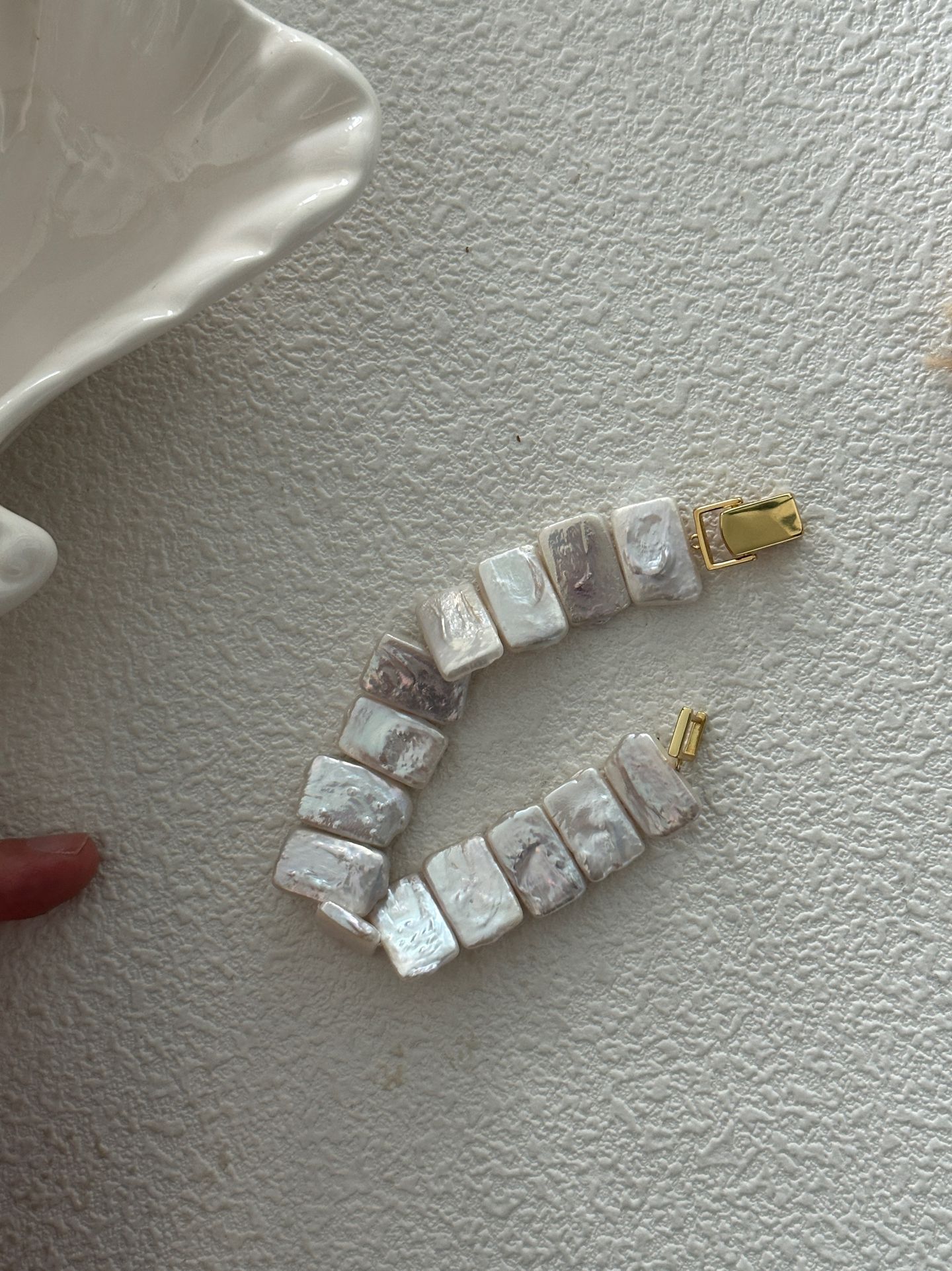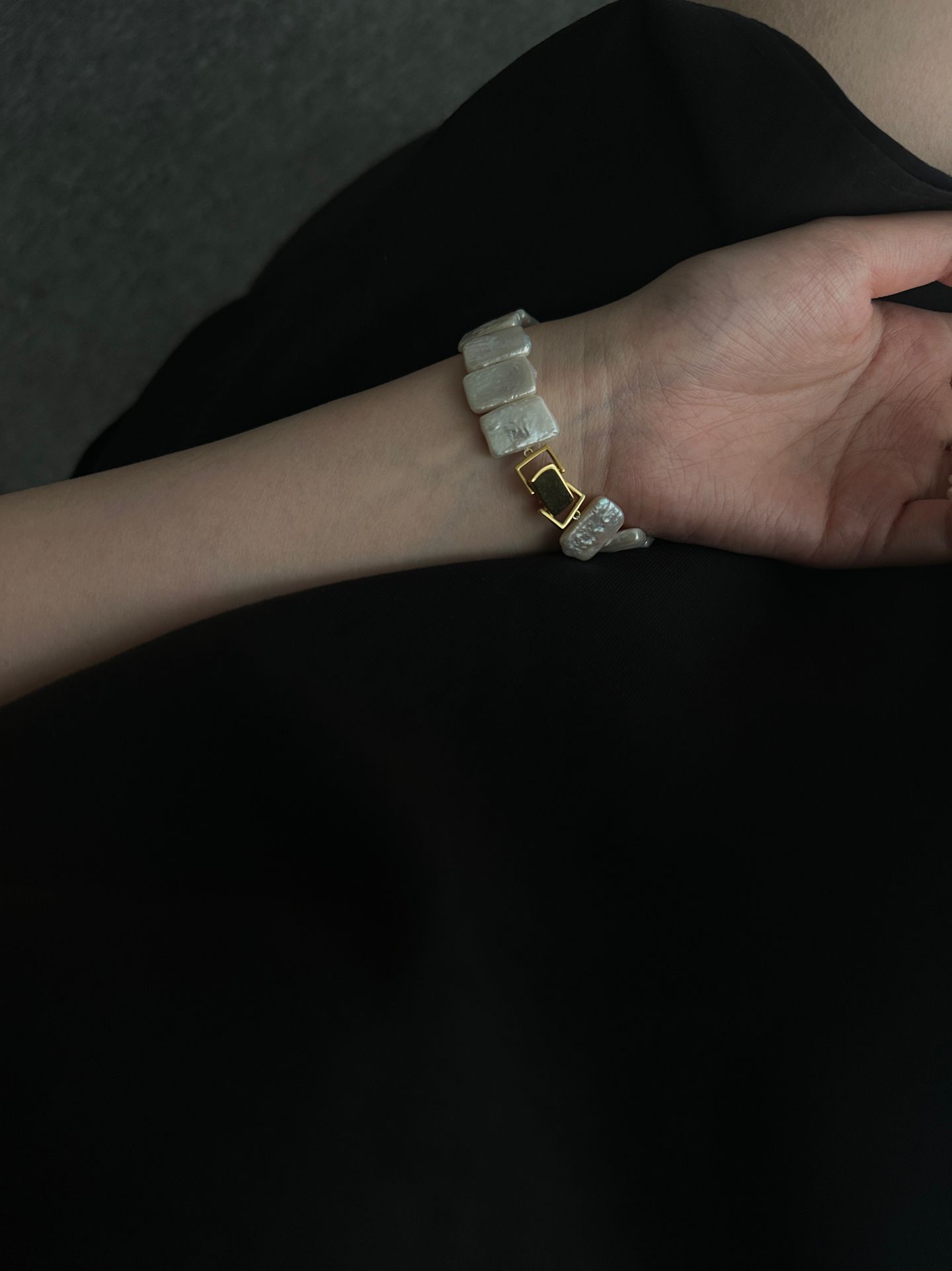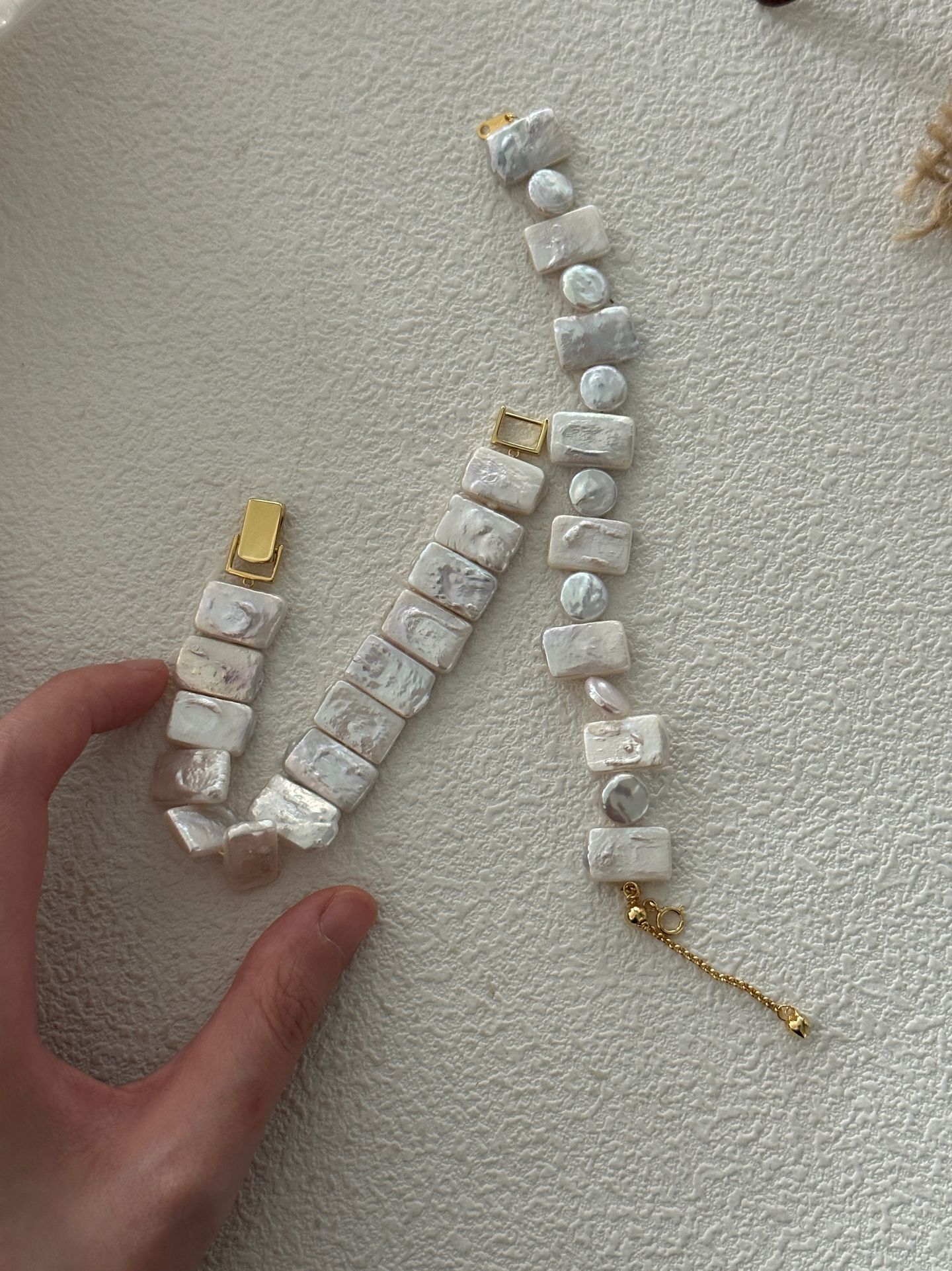 This distinctive bracelet adopts a unique watchband-inspired design, crafted from square-shaped baroque pearls that are neatly spliced together, mimicking the sleek profile of a watch strap while showcasing the natural, irregular texture and soft iridescence of baroque pearls. It is available in two sizes for a tailored fit: Size S is suitable for wrists smaller than 14.5cm, and Size M fits wrists larger than 14.5cm, ensuring a comfortable and snug wear for different wrist circumferences.