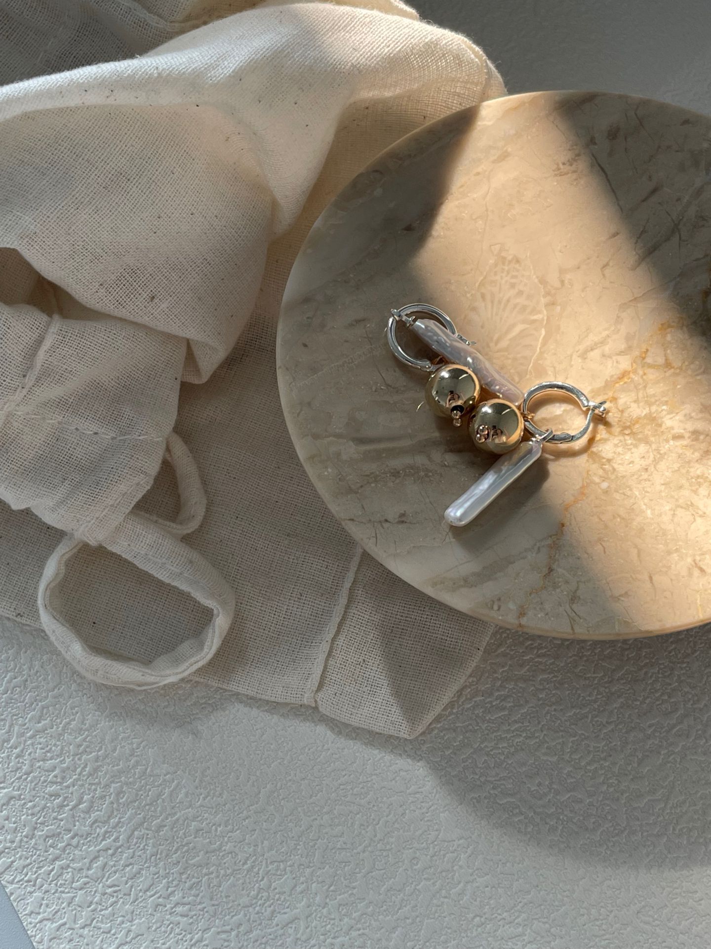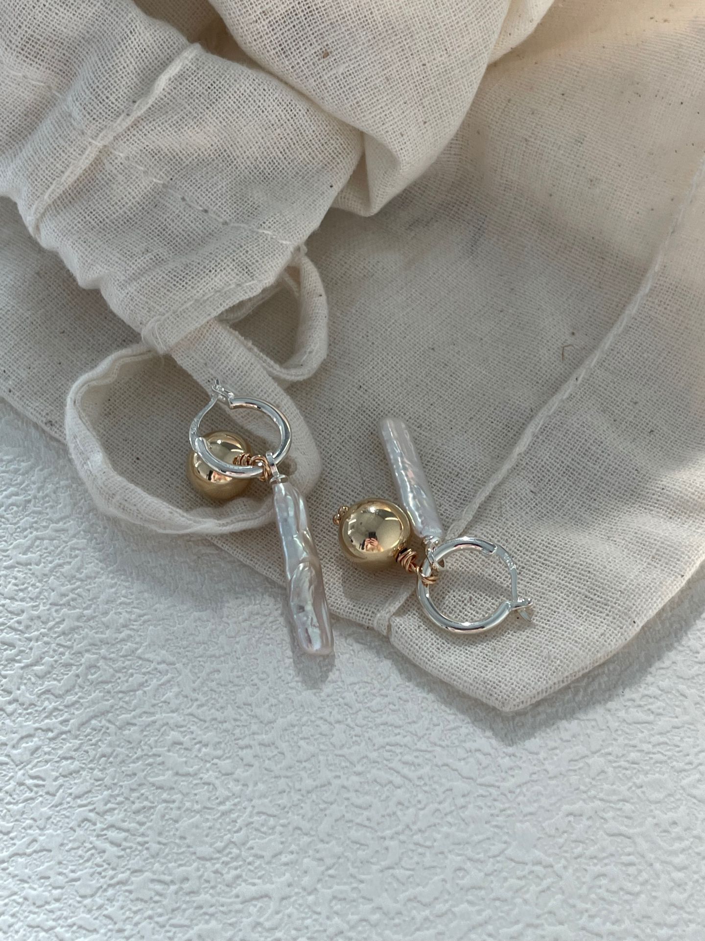 两种材质,一副耳环。圆球:精准、完整、确定。巴洛克珍珠:自由、独特、出乎意料。