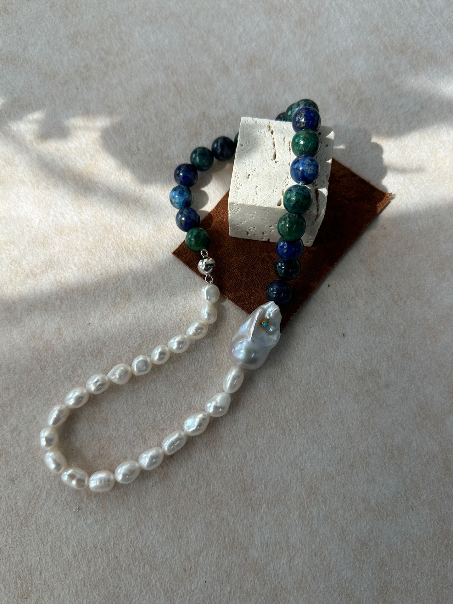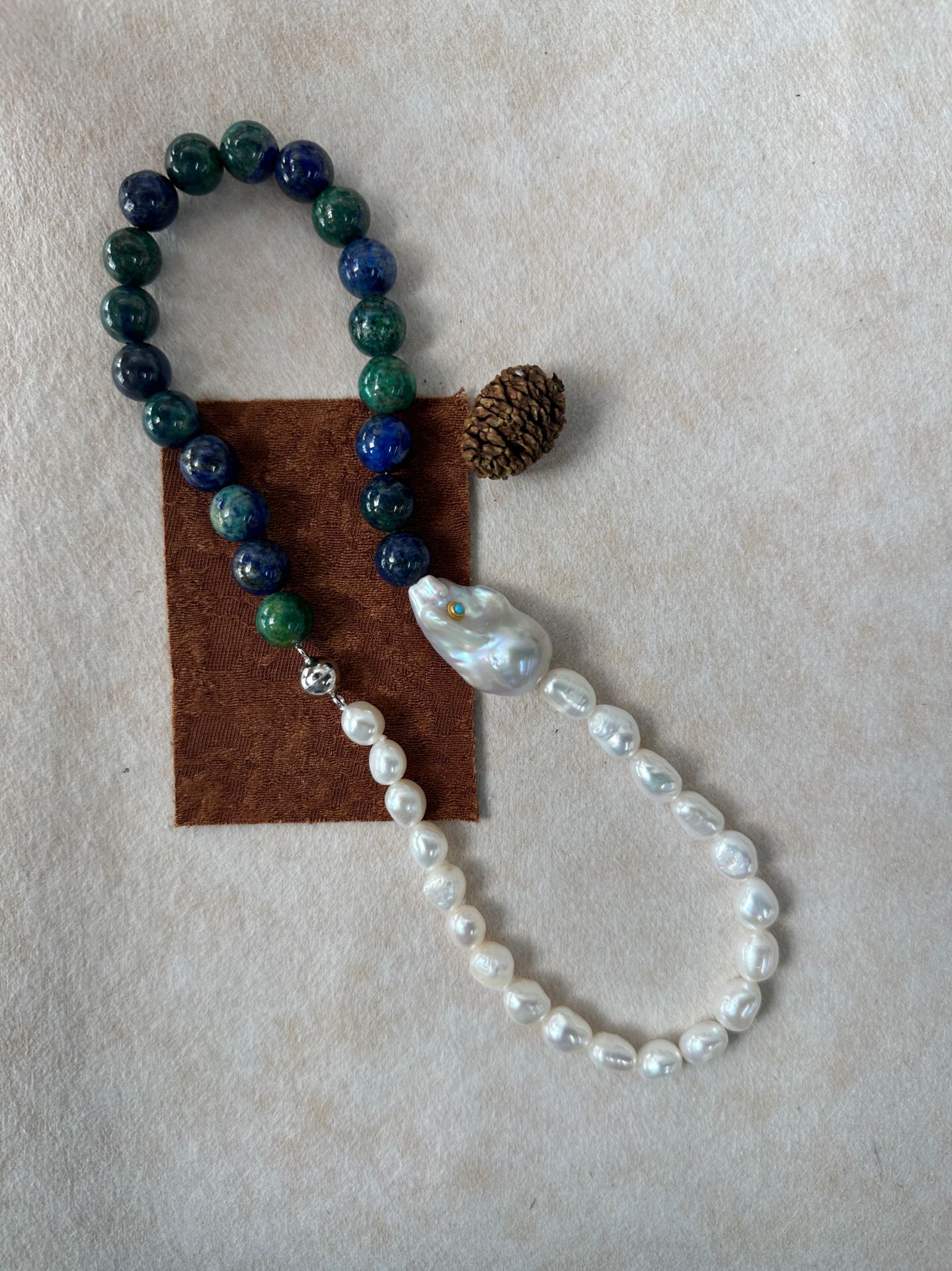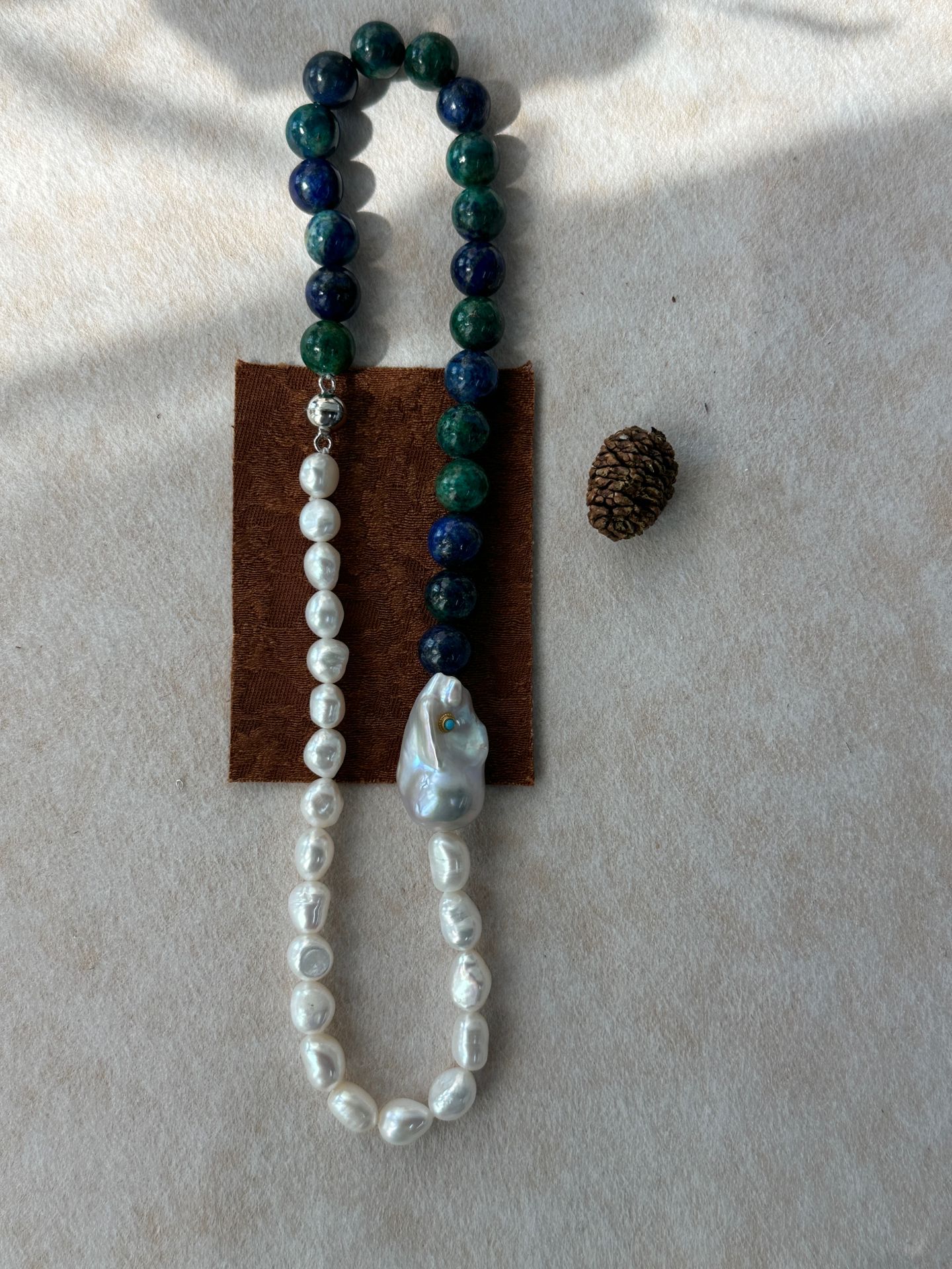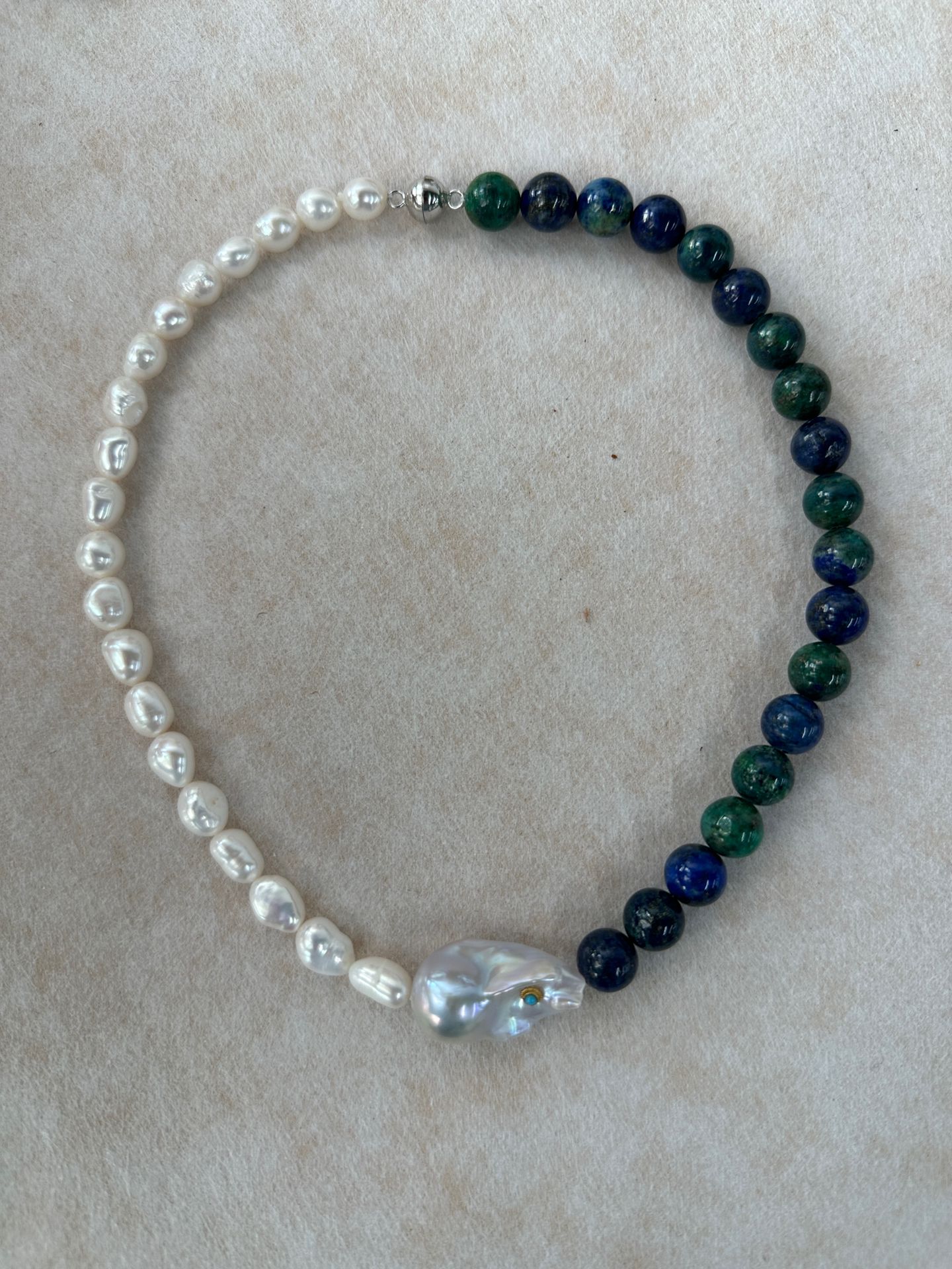 Handcrafted with natural turquoise beads and an iridescent baroque pearl pendant, this necklace blends earthy boho charm with timeless elegance.