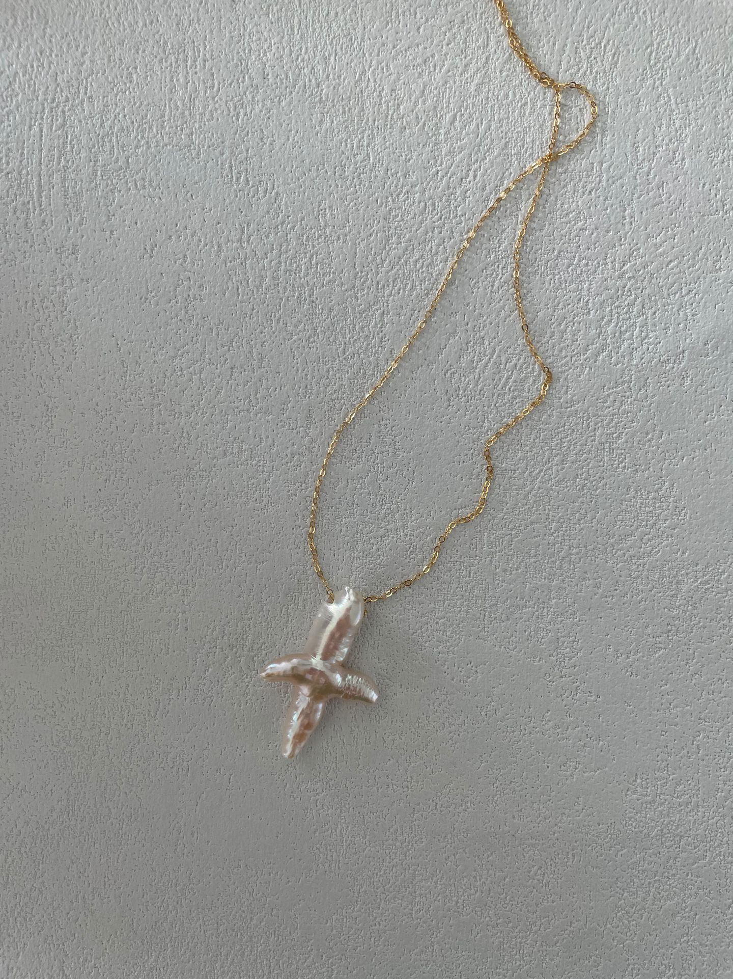 At its center, an organic cross-shaped baroque pearl pendant serves as a striking focal point, showcasing a subtle iridescent sheen and one-of-a-kind texture. The soft, creamy tones of the pearl contrast beautifully with the sleek gold chain, creating a look that balances minimalist elegance with artistic edge.